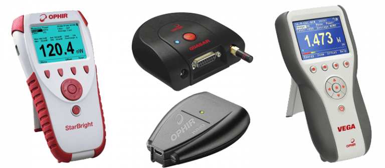 Ophir power meters and PC interfaces; clockwise from top left: Vega, Nova II, Juno, Quasar