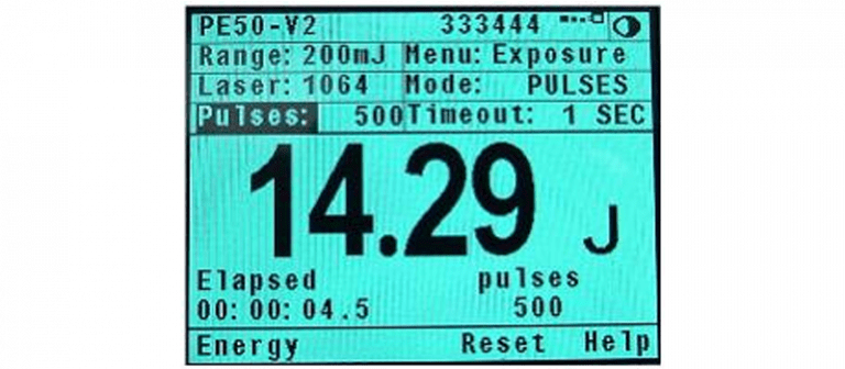 You can measure exposure easily with most Ophir power meters, in conjunction with a pyroelectric energy sensor. Just select “menu” to access the function menu, and then select “exposure.” The power meter will now display the total exposure (energy) instead of the energy per pulse.