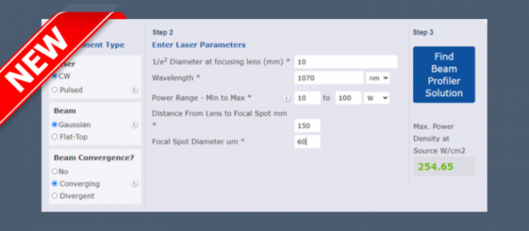 弊社ウェブサイトには、これらの決定をサポートする ビームプロファイルファインダーを掲載しておりますので、ぜひご利用をお待ちしております。ご利用の際は、必要な入力パラメターを入力していただくだけで、適切なビームプロファイリングソリューションがリスト提示されます。下記にその使用例がありますので、お客様のデータに合わせてご参照ください。