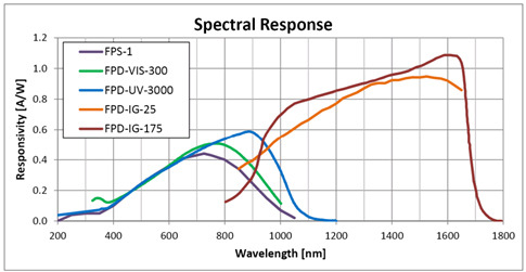 Responsivity is defined as the produced photocurrent (in Amperes) per Watt of incident radiation. It is a function of wavelength. Hence, the spectral response of the photodiode should be as high as possible at the wavelength of the laser to be measured. The spectral responsivities of the FPD series are shown in the figure. Ophir offers several fast photodiodes models with Silicon photodiodes having spectral response from 320 nm to 1100 nm, UV enhanced Silicon with extended response from 193 nm to 1100 nm, and InGaAs photodiodes which are sensitive from 900 nm to 1700 nm.
